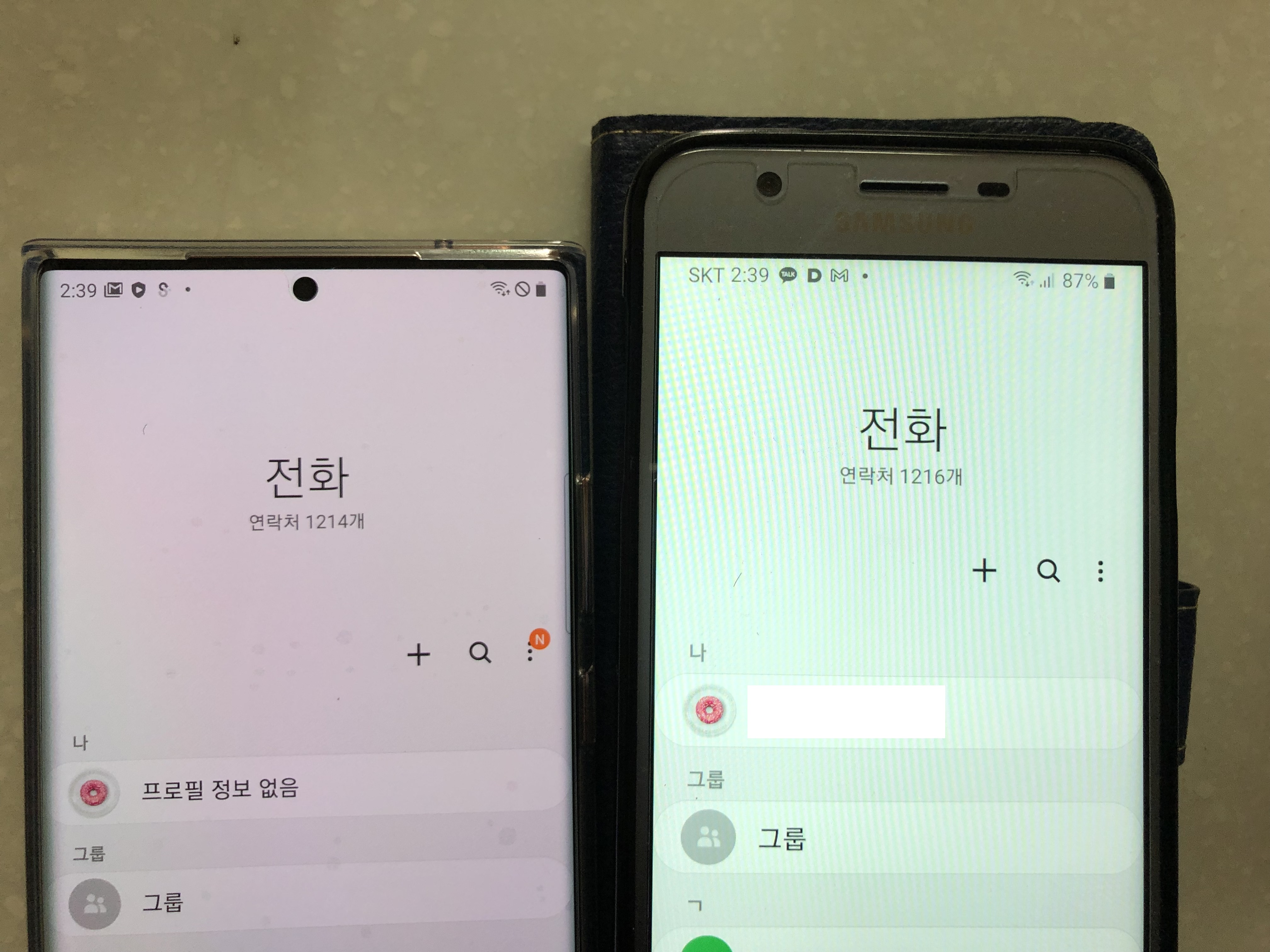 - 기존 휴대폰(오른쪽), 옮긴 휴대폰(왼쪽) 주소록을 보면 2개가 차이남