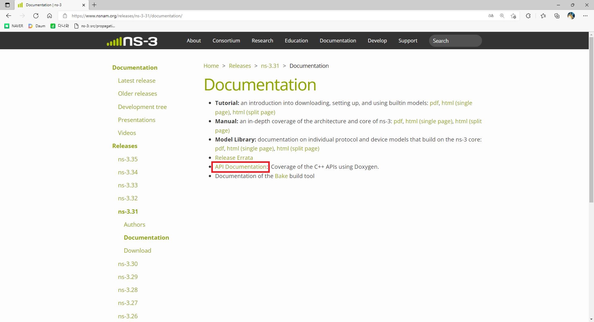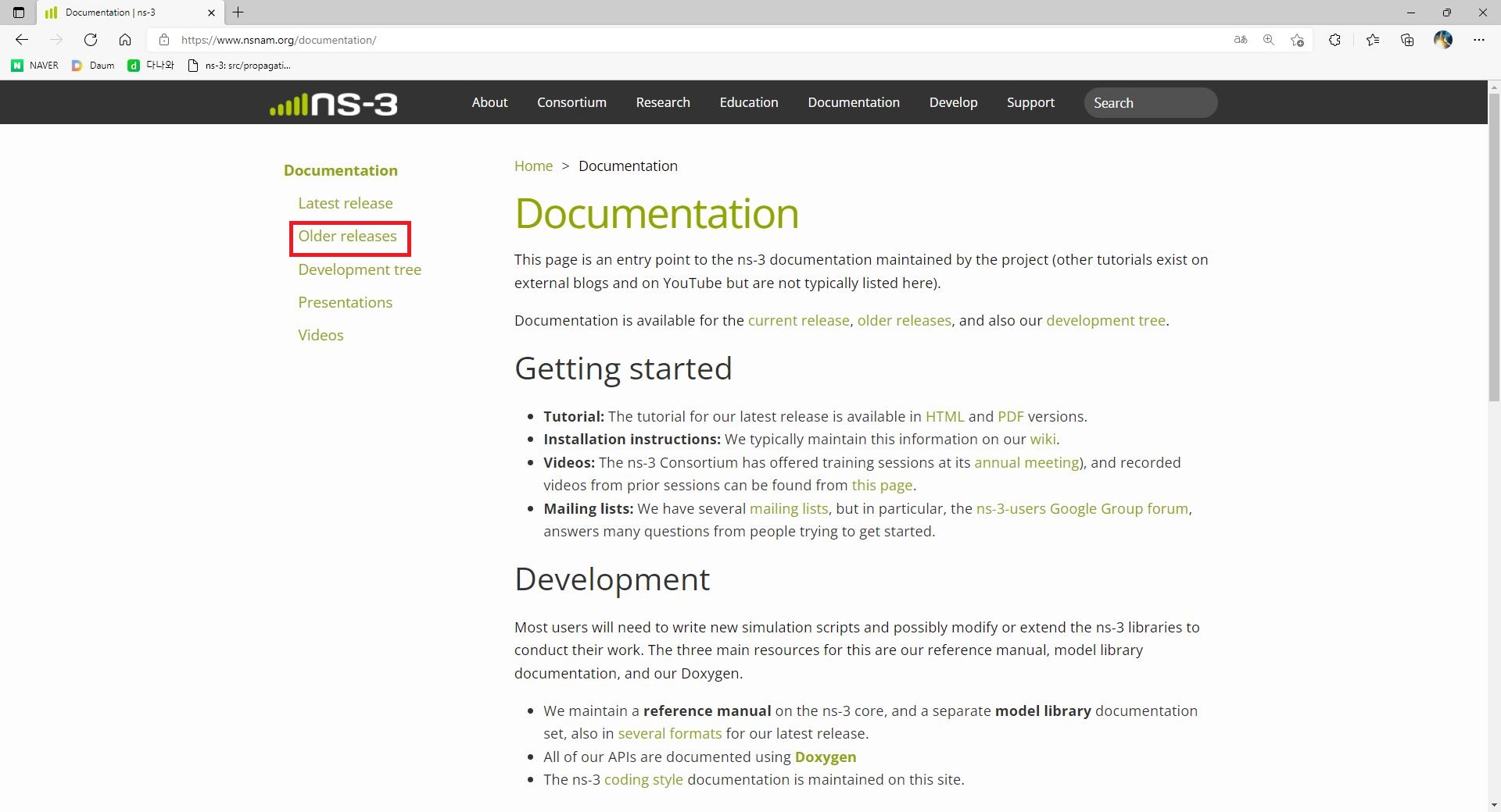 1. NS3 홈페이지에서 "documentaion"(빨간 네모) 클릭