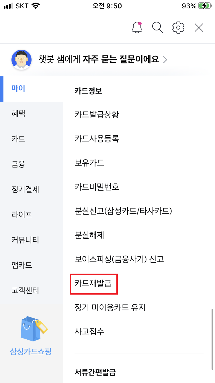 2) 왼쪽 바3 눌러서, 마이->카드정보->카드재발급 선택