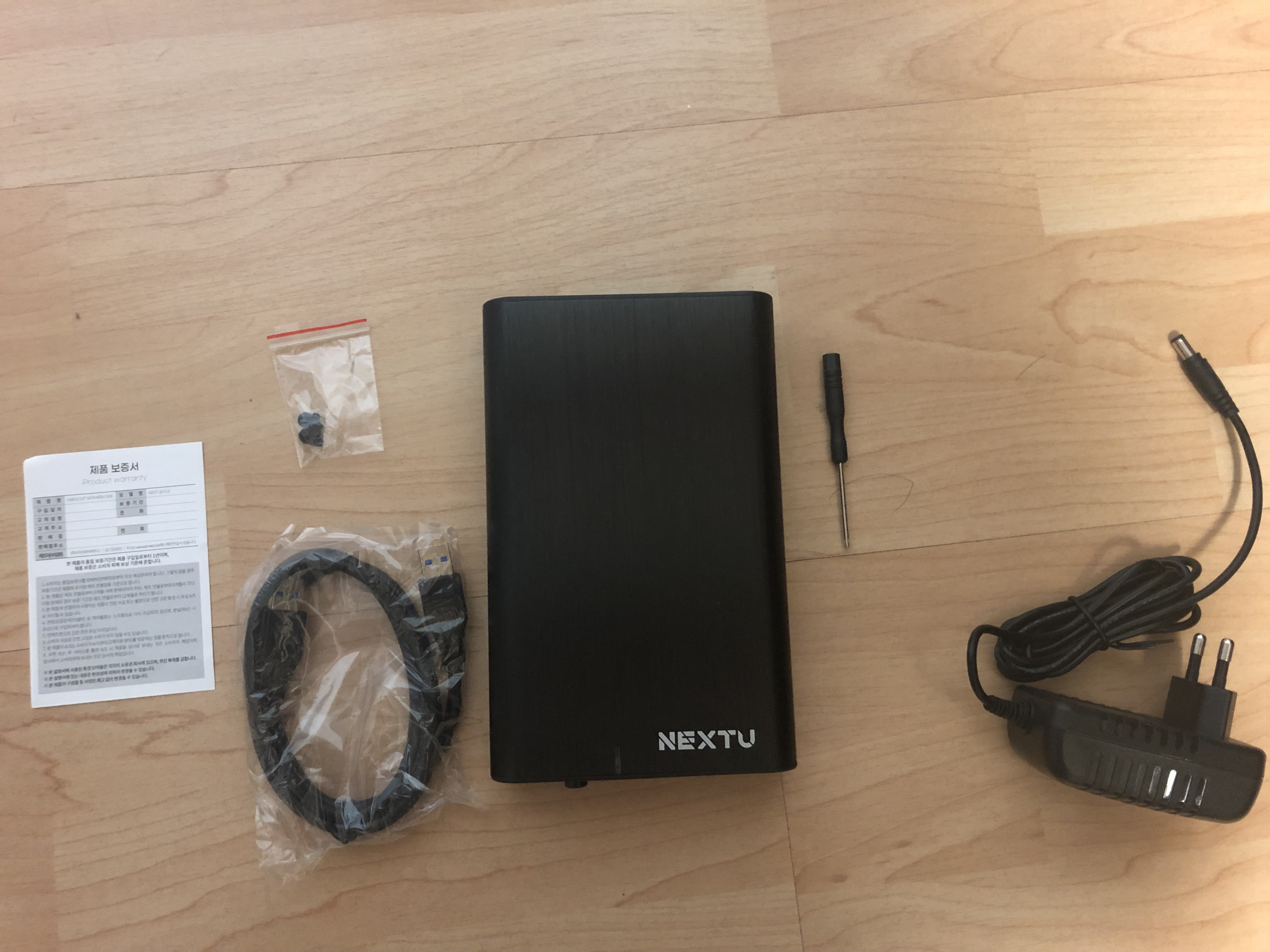 (왼쪽부터)설명서, 고정 나사, 케이블, 외장하드 케이스, 소형 드라이버, 전원 케이블