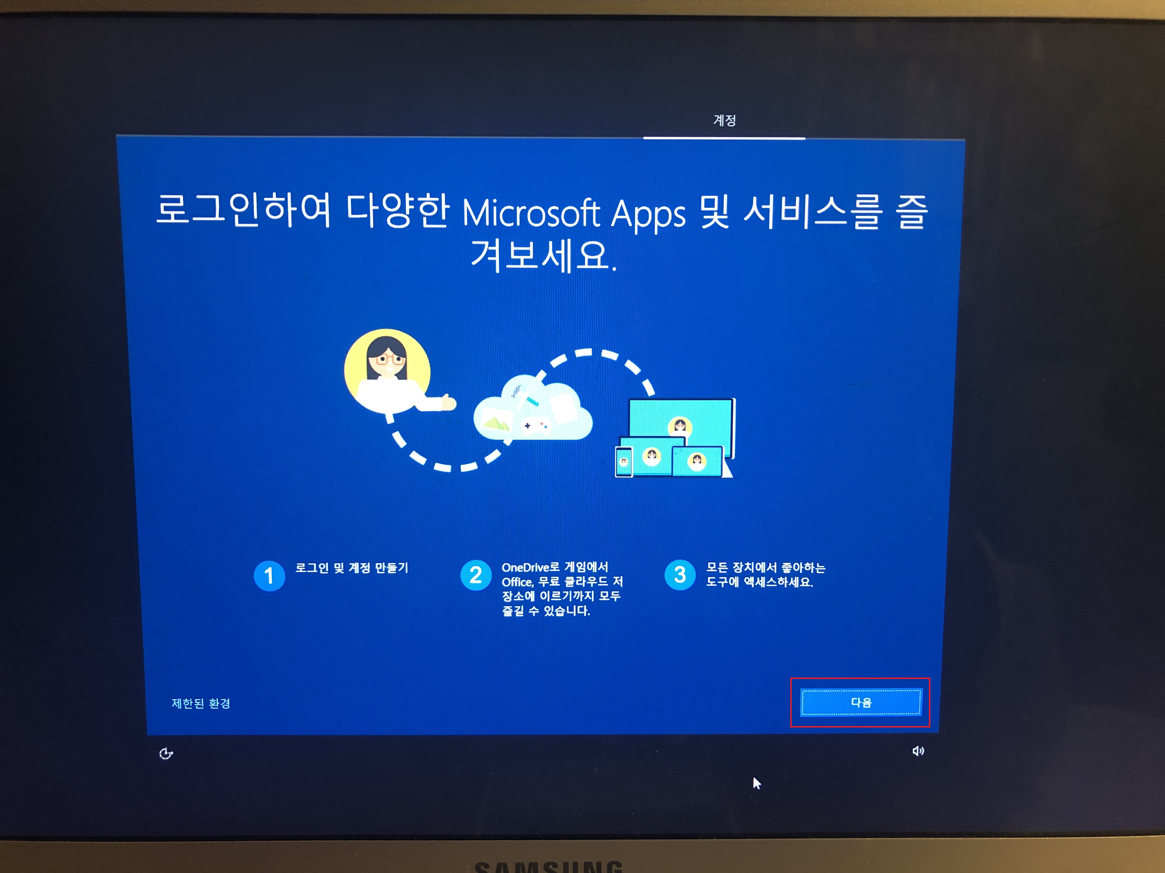 12. 마이크로소프트 계정 연결 원하지 않으면, 빈칸에 "다음" 클릭