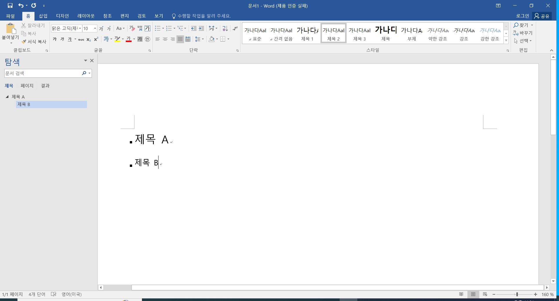 IT/MS word 워드 [워드]목차 만들기 by DJpeng 2022. 12. 6. 1. 내용 작성 및 "제목 1(빨간 네모)" 누르기 2. 목차에 제목A가 보이는 것을 확인할 수 있음 3. 더 낮은 레벨의 제목을 만들고 싶은 경우는 "제목 2"를 사용하면 됨. 반응형 공유하기 게시글 관리 Communication Diary 댓글