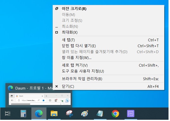 작업표시줄에서 엣지 아이콘에 오른쪽 마우스 클릭해서 "최대화" 선택하기