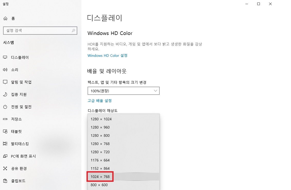 컴퓨터 해상도: 1024x768로 변경