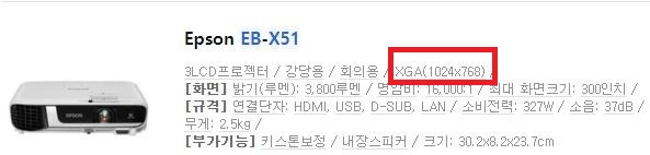 Ex) 앱손 EB-X51 해상도: 1024x768(XGA)