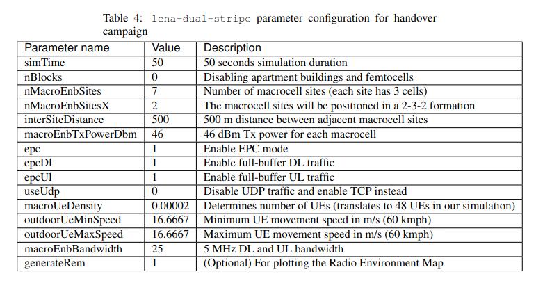 ./waf --run="lena-dual-stripe --simTime=50 --nBlocks=0 --nMacroEnbSites=7 --nMacroEnbSitesX=2 --epc=1 --useUdp=0 --outdoorUeMinSpeed=16.6667 --outdoorUeMaxSpeed=16.6667 --ns3::LteHelper::HandoverAlgorithm=ns3::NoOpHandoverAlgorithm --ns3::RadioBearerStatsCalculator::DlRlcOutputFilename=no-op-DlRlcStats.txt --ns3::RadioBearerStatsCalculator::UlRlcOutputFilename=no-op-UlRlcStats.txt --ns3::PhyStatsCalculator::DlRsrpSinrFilename=no-op-DlRsrpSinrStats.txt --ns3::PhyStatsCalculator::UlSinrFilename=no-op-UlSinrStats.txt --RngRun=1 --generateRem=1" > no-op.txt
